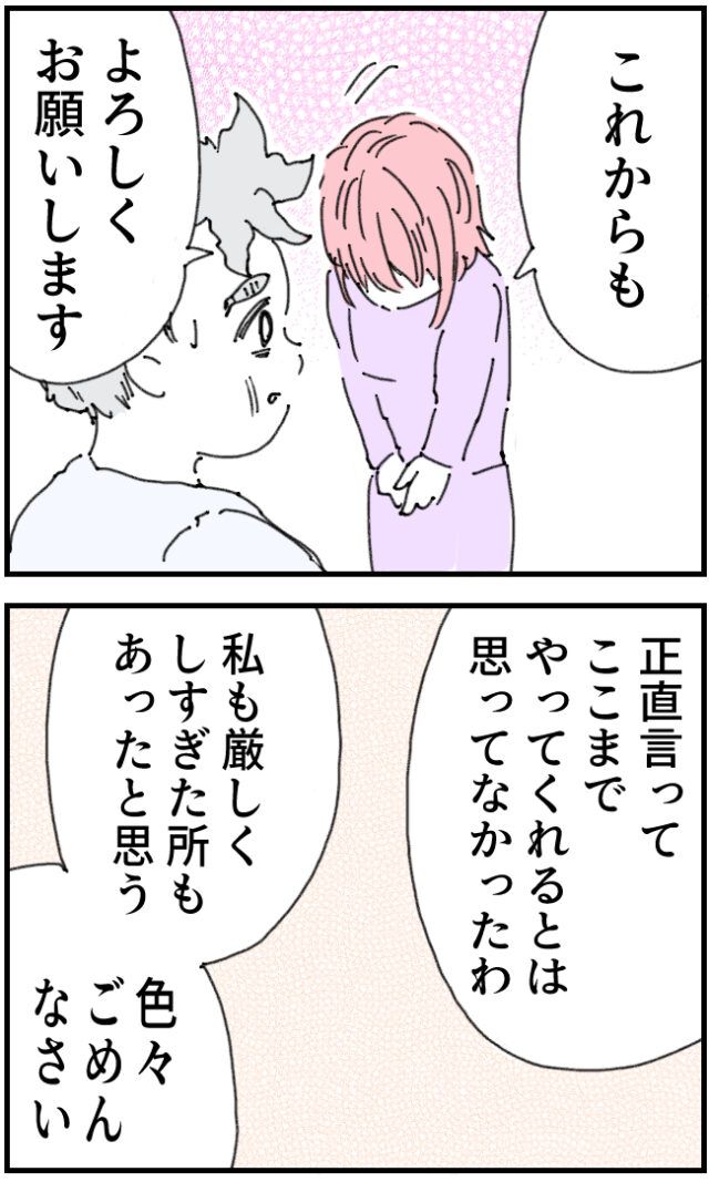 「この3日間のあなたをみて、本当に真剣に考えた結論が出たわ・・」かおりさんにそう切り出されたいちろうさんが身構えていると、「これからもよろしくお願いします」深々と頭を下げるかおりさんの姿が!「正直言って、ここまでやってくれるとは思ってなかったわ。私も厳しくしすぎた所もあったと思う。いろいろごめんなさい」