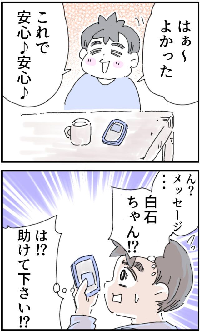 かおりさんに「これからも家族3人で仲良くやっていきましょう」と言われ、こはるちゃんの父親として、かおりさんの夫として認められたと安心するいちろうさん「はぁ~よかった。これで安心!安心!」とホッとしていたところ、スマホに気づきました。「ん?メッセージ・・白石ちゃん!?は!?助けてください!?」突然白石さんから送られて来たメッセージに驚きました。