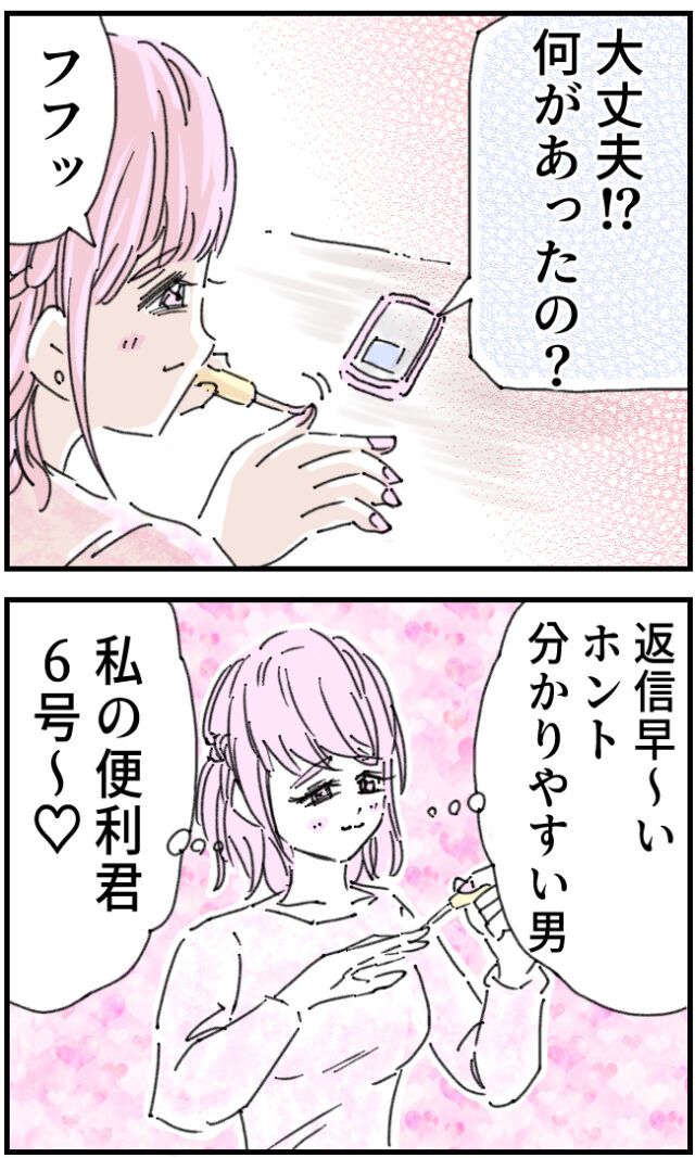 「大丈夫!?何があったの?」慌てて白石さんにメッセージを送ったいちろうさん、「フフッ」それを見た白石さんは「返信早~い。ホントわかりやすい男。私の便利君5号~!」とネイルをしながらいちろうさんの返信を見ていました。