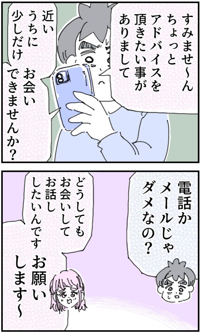 そして「すみませ~ん。ちょっとアドバイスをいただきたい事がありまして。近いうちに少しだけお会いできませんか?」白石さんからの返信メッセージを見てすかさず「電話かメールじゃダメなの?」と返すいちろうさんに、「どうしてもお会いしてお話ししたいんです。お願いします~」と白石さん。