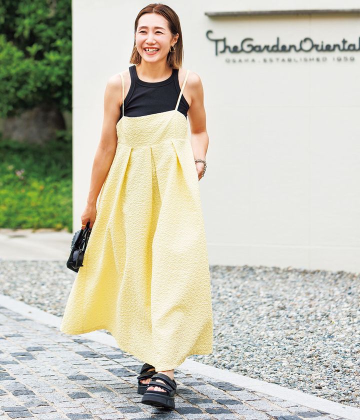 『色物は苦手ですが、黒のタンクを入れたら意外としっくり。小物も黒で統一すれば、華やかなカラーでもモードに。イエローワンピはプチプラで挑戦します。』