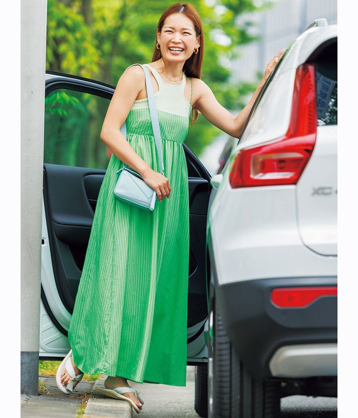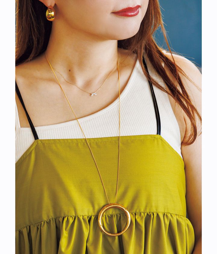 『コンサバ顔なのでカラーワンピは避けていましたが、タンクのおかげで抵抗感を払拭。大ぶりネックレスと、ヒールありのサンダルで少しキレイめに。』