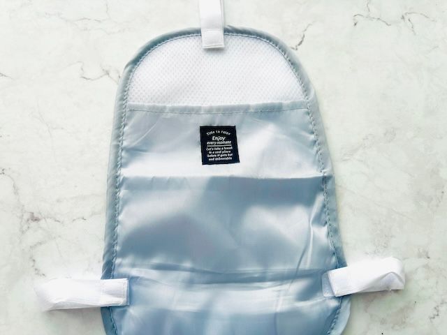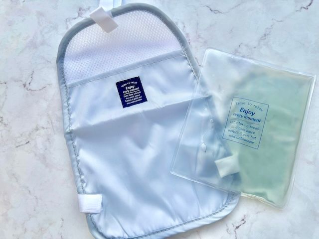 グレーのポケットに保冷剤を入れて使います。上部と左右に面ファスナーのついたベルトがついていました。