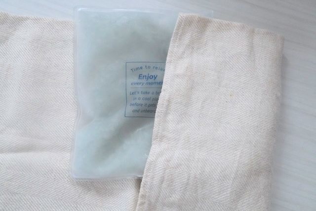 布で包むことによって保冷剤の結露が吸収されるので、服が濡れることもありません。