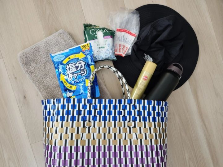 帽子とサングラスは頭と目を紫外線から守るために必携、さっとケアできるスプレータイプの日焼け止めも持参します。飲み物も必ず持ちますが、今年の猛暑は熱中症が怖いので、ランニングするときと同様に、塩タブレットを常に持参。また、地味に岩場などで足を切ったりすることも多いのが海ですよね。ママはちゃんと絆創膏も忍ばせていますよ!