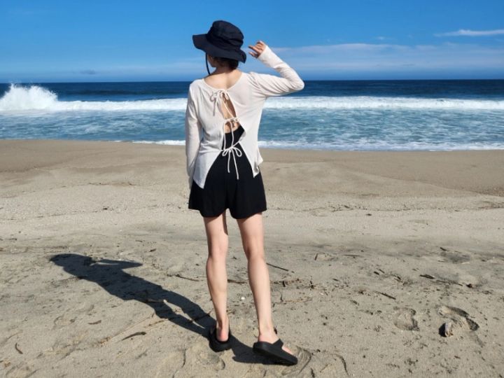 子どもたちと一緒に海へ行くときは、もちろん自分も水着になりますが…若いときのように面積の狭い水着は難しいものです。そこで大人も気負わず着られる体型カバー水着に限る!ということで、前面ではなく背面にデザインがある物を選んでこなれ感UP♪を狙ってみました。黒のロンパースタイプの水着は、背面が大胆に開いているデザインでそこが決め手に。しかも気になるお腹周りや、遊んでいて忘れがちな胸元も隠してくれるので、子育てママにはうってつけの1着でした。
