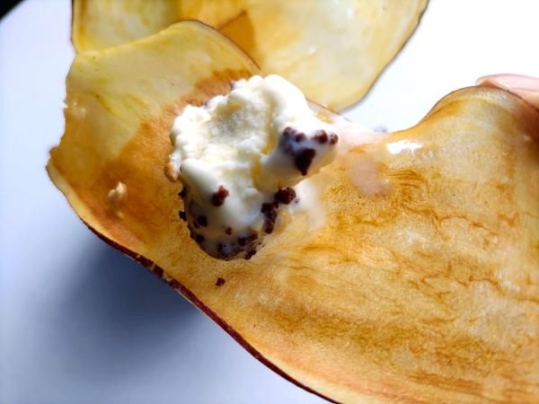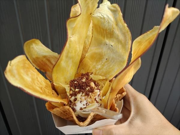 アイスを「さつま芋チップ」にのせて食べると、パリッ!ザクッ!とした食感! アイスの冷たさとさっぱり感、そして「さつま芋チップ」の香ばしさが絶妙にマッチ。 美味しくて、いくらでも食べられそう!