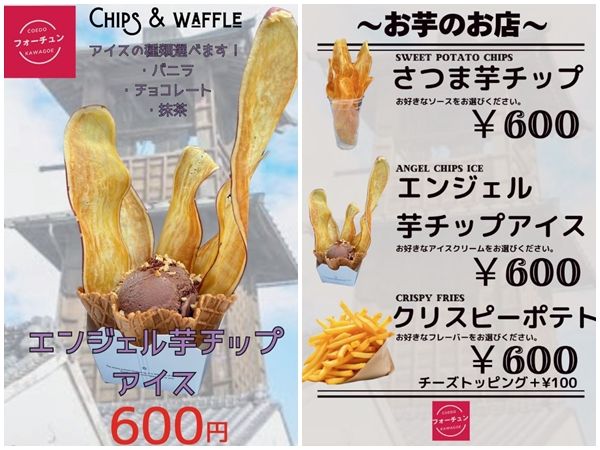 看板スイーツの「エンジェル芋チップアイス」をはじめとしたドリンクやポテト、冷たいかき氷などを販売しており、様々なメニューを取り揃えています。 暑い夏の川越散策に、まさにオアシス的な存在です。