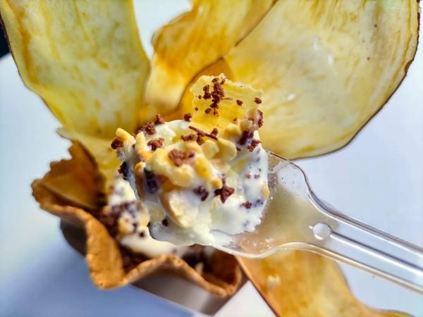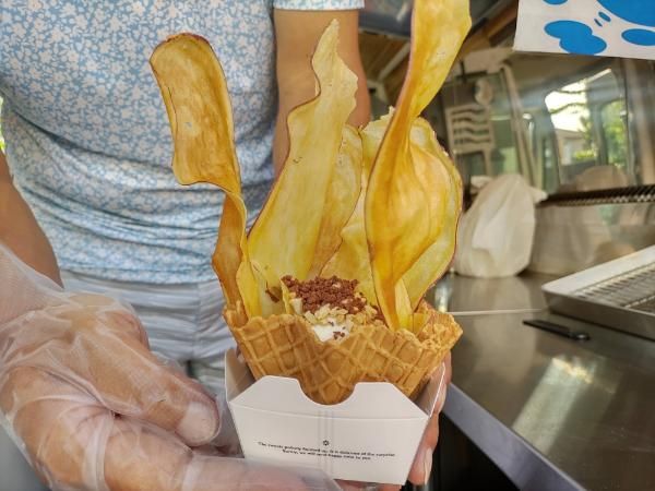 器には、ワッフルコーンが使われており、外側はバリバリで底の部分はアイスで、しんなりとした異なる食感が楽しめます。 器ごと、最後まで余すことなくいただけるのが嬉しいポイント!