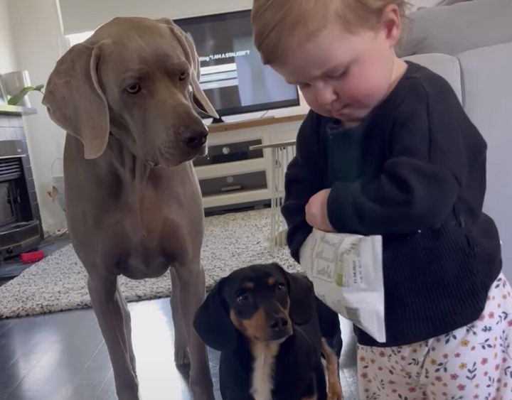 3人だけのヒミツね〜! こっそり愛犬にオヤツをあげちゃう男の子。