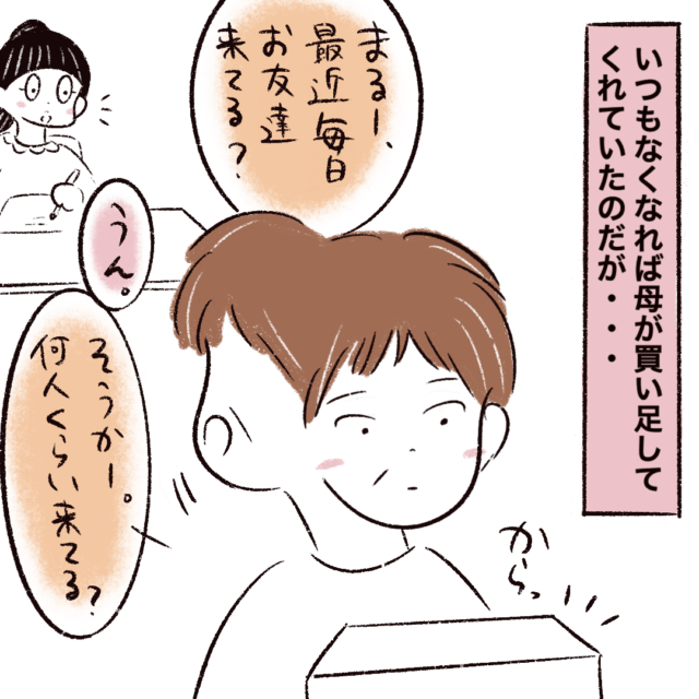 いつもストックが無くなるとお母さんが買い足してくれていましたが、今までよりも減りが早いことを不思議に思ったお母さんから「最近お友達来てる?」と聞かれ「うん」と答えると「何人くらい来てる?」と聞かれました。