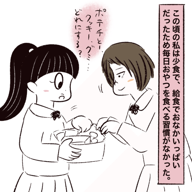 おやつを欲しがるさなかちゃんに自分のおやつストックから出してあげていたまるさん。この頃のまるさんは少食で、給食でおなかいっぱいになっていたため帰宅後に毎日おやつを食べる習慣がありませんでした。