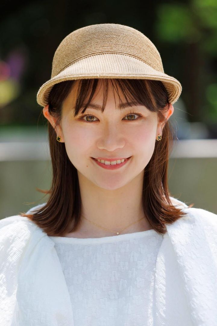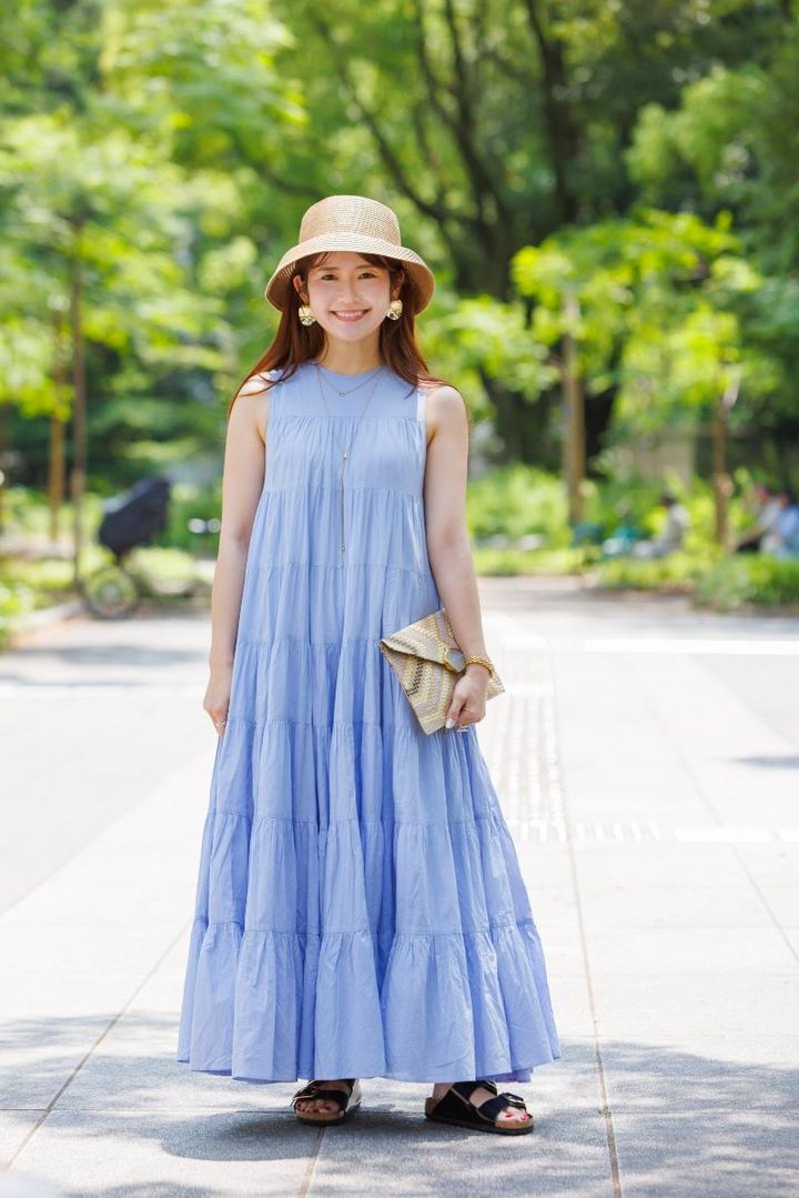「麦わら帽子はリボンなどの飾りは一切なく、ころんとした形や肌映りのいいベージュを選ぶようにしています。シンプルなので、どんな服に合わせてもマダムっぽくならずお気に入り。ダウンヘア×ワンピースは甘くなりがちなので、ピアスは辛口なものを合わせるのがルールです」小松茉里さん・160㎝(会社員/8歳と6歳の女の子ママ)