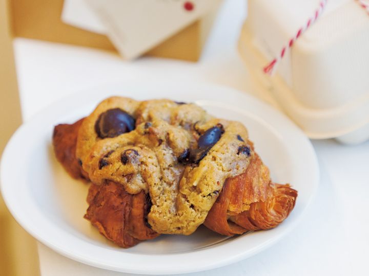 クロワッサンにクッキー生地をのせた「クロッキー」が今韓国で大人気。サクッサクの生地の中にチョコチップがたっぷり。オリジナルチョコチップクロッキー₩6,300。