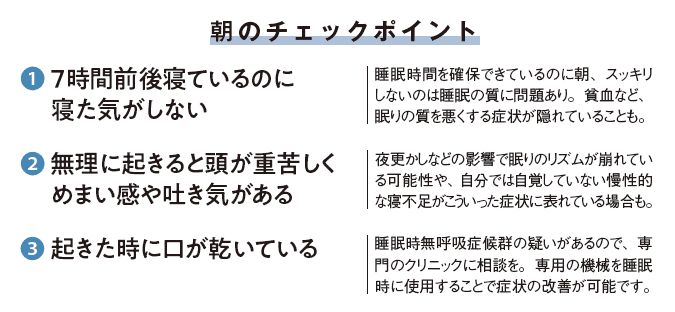 朝のチェックポイント3つ。寝起きの状態をチェックします。