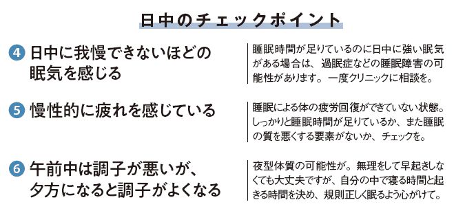 日中のチェックポイント3つ。眠気や疲れの感じ方を思い出して。
