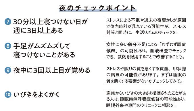 夜のチェックポイント4つ。寝つきのよさや、寝ている間の状態を確認。