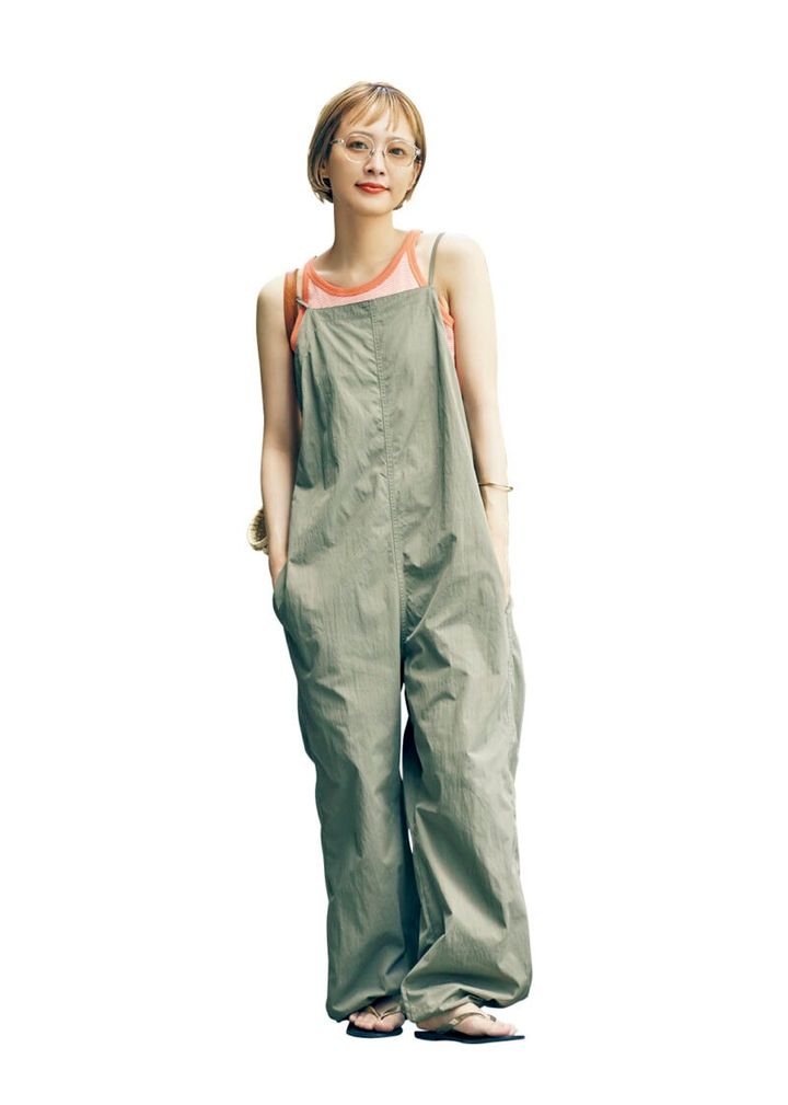 「真夏に似合うオレンジとメンズライクなカーキでカジュアル&ヘルシーなカラー配色を楽しんでいます。ゆったりとしたフォルムのオールインワンと、ミニマムなアメスリタンクのメリハリバランスでさりげなく女っぽさも」オールインワン¥20,900(スピック&スパン)、タンクトップ¥5,390(ロバートピーミラー)、バッグ¥15,400(ケッシュ ル エッセンシャル)、サンダル¥9,350(ニコラスライナス/すべてスピック&スパン ルミネ有楽町店)