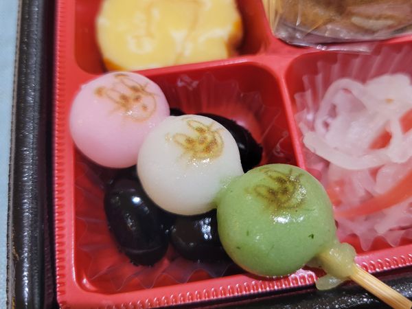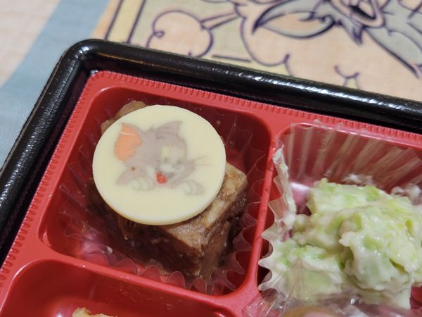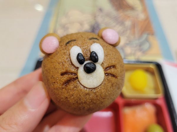 一の重は「和のお祝い重」。焼海老や数の子などのおせち定番のメニューから、チーズ味伊達巻、キャラクターをあしらった三食団子など、トムジェリらしさもばっちり。存在感ありありのじょうよ饅頭「トム」は、こしあん入りです。