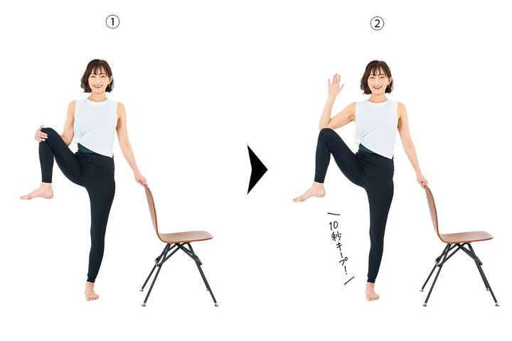 骨盤を正しい位置に整え綺麗な姿勢を保つために必要な腸腰筋をトレーニング。硬くなった腸腰筋を伸ばし緩めます。椅子に手を添えて、背中が丸まらないように脚を上げ、手で脇に引き寄せられるだけ引き寄せます。