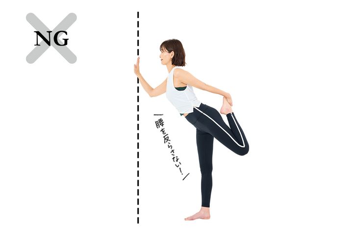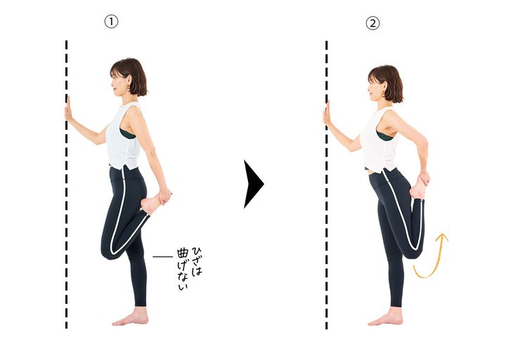 ①壁に手をつき、もう片方の手で足の甲をつかみます