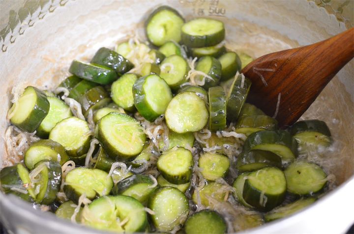 砂糖が溶けたらきゅうりを入れて炒めます。