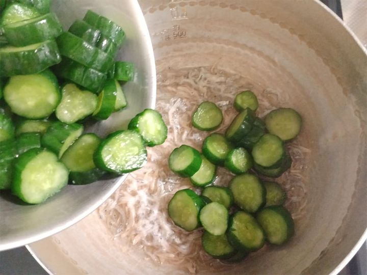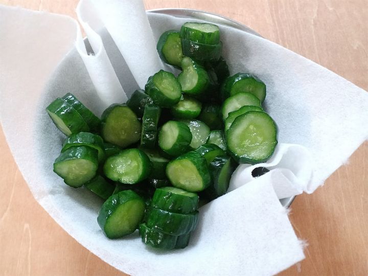 1.きゅうりを8mmほどの輪切りに、塩をまぶして冷蔵庫で一晩寝かす。