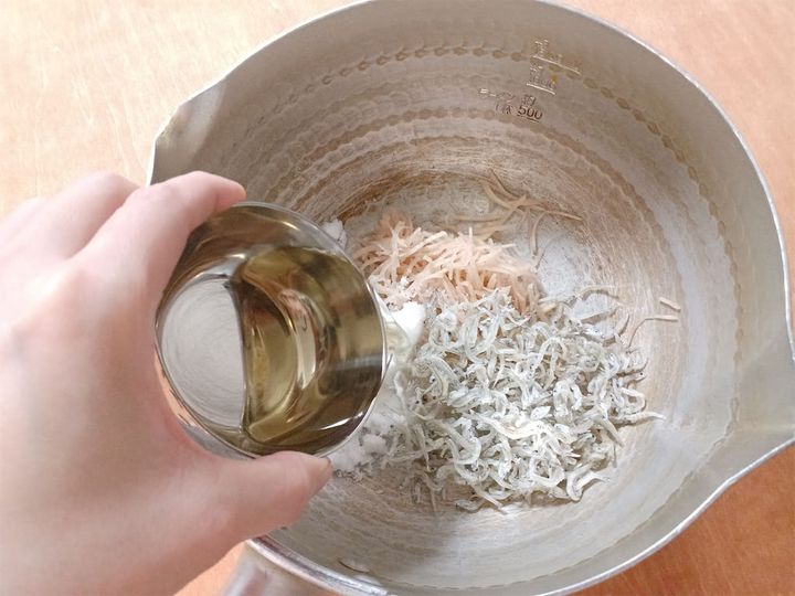 2.1のきゅうりの水気を絞り、[A]をフライパンに入れて火にかける。砂糖が溶けたら、きゅうりを入れて水分がなくなるまで炒りつける。