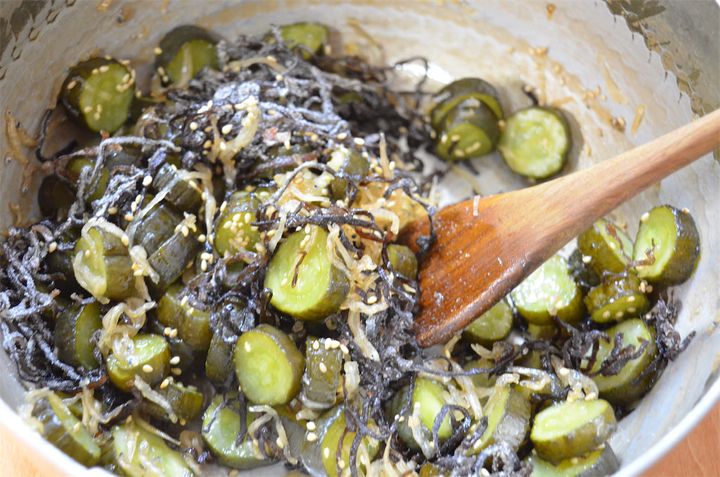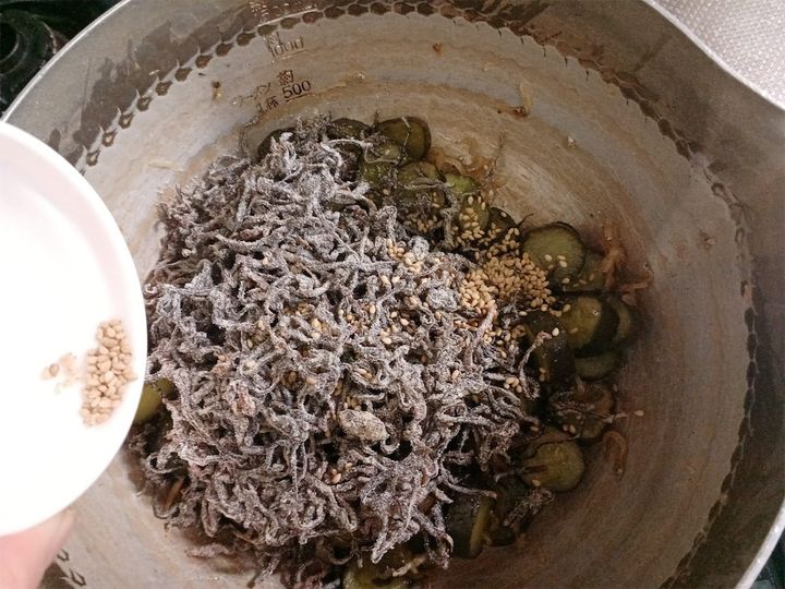 水気がなくなりきゅうりがクタッとしてきたら、仕上げの塩昆布と白いりゴマを加えて混ぜ合わせたら出来上がり。