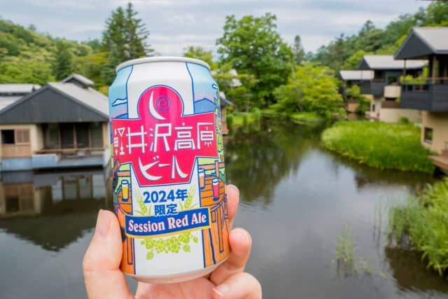メディテイションバスのテラスでは、15時から19時まで無料のドリンクを用意。季節によってドリンクの種類が変わります。伺った夏の初めには地元のクラフトビール「軽井沢高原ビール」と信州産のリンゴジュースが冷蔵庫で冷えていました。美しい風景を眺めながら湯上りの1杯は格別でした。