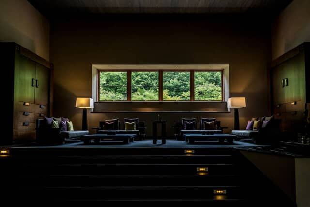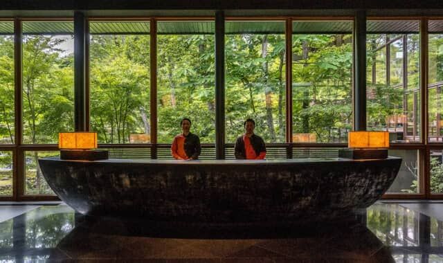 チェックインをする場所は2通り。駐車場のあるレセプションでチェックインをして、電気自動車で直接宿泊棟へ向かうか、フロントやラウンジ、レストランがあるメイン棟「集いの館」で行います。「集いの館」にあるフロントカウンターの背後には、豊かな緑が広がって、これから自然と一体となる滞在を予感。スタッフは “谷の住人” と呼ばれ、手作りの制服は一人ずつ柄が異なります。
