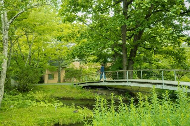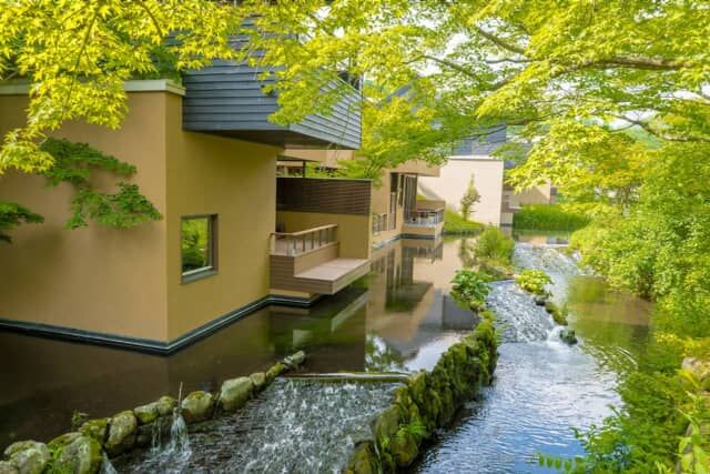 星のや軽井沢の客室は、分棟型の客室棟が宿泊エリア “谷の集落” に点在しています。集いの館を出ると、川が流れ、樹木が立ち並ぶ間を遊歩道に沿って、アサインされた建物へ向かいます。水と緑の美しい風景こそ、星のや軽井沢の見どころです。