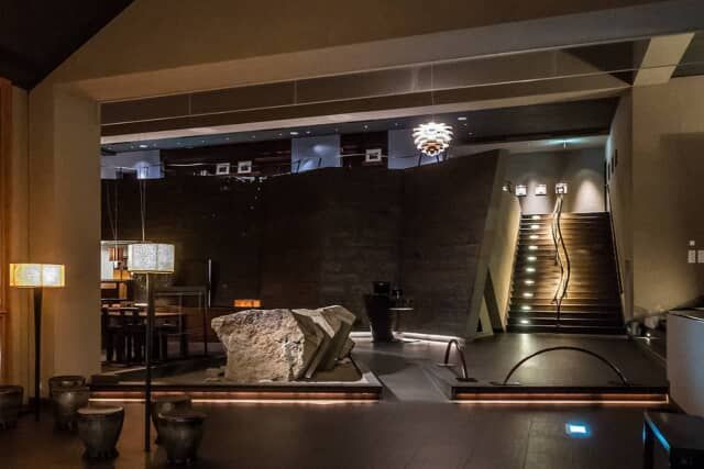 黒々とした石造りの壁は浅間山をイメージ。手前には、瀬戸内海から取り寄せた大きな石が飾られます。別棟にある客室へ向かうには、階段を上り、外へ向かいます。階段は古い日本家屋の階段をイメージ。