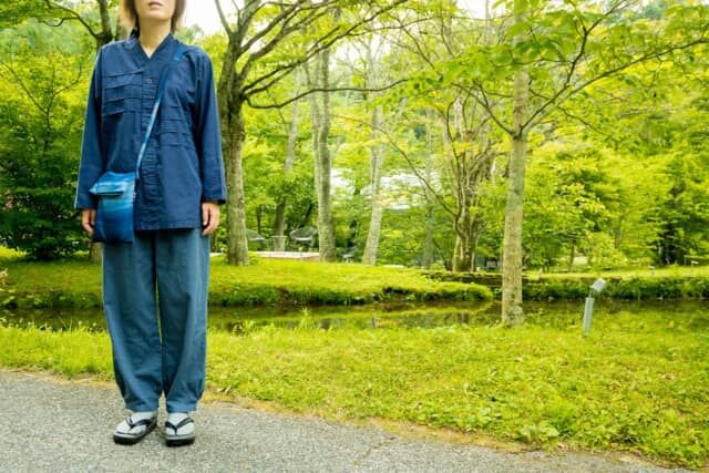 藍色の動きやすい作務衣。このスタイルでレストランやカフェなども利用可能で、16店舗が集まる「ハルニレテラス」にも入れます。肩から掛けている “お散歩袋” は財布やルームキー、星野エリアの地図が描かれた冊子を入れるにはちょうどいい大きさ。持ち帰りができるので、いいお土産になりました。