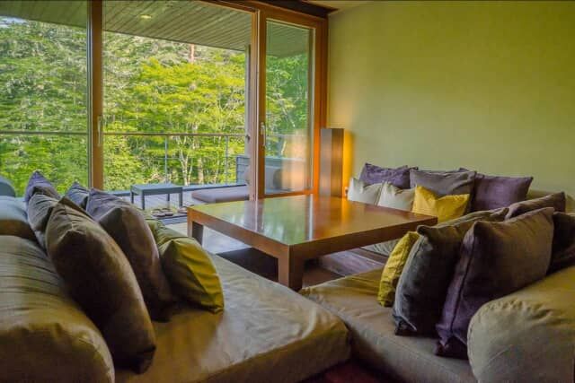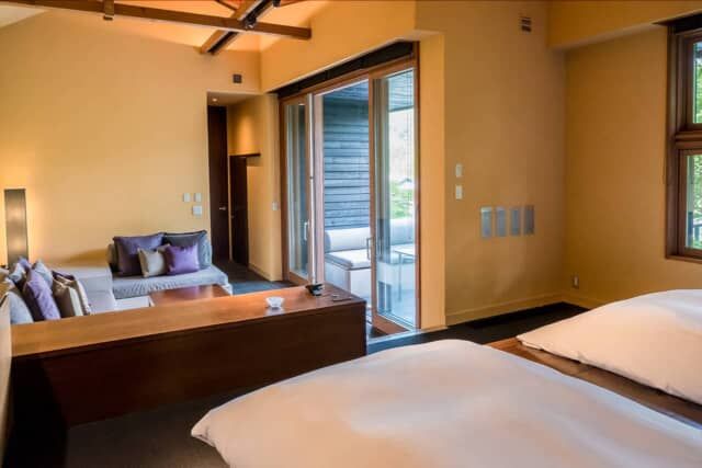 クッションがたくさん置かれたソファーはベッドとしても利用できて、最大4名まで宿泊可能。全ての客室には時計やテレビがなく、窓を開ければ川を流れる水の音や森を渡る風の音、どこからともなく聴こえてくる鳥たちのさえずりが、リビング内で反響し、部屋いっぱいに満たされます。