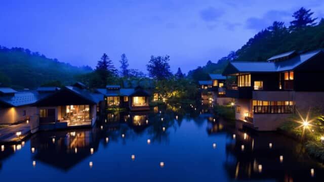 広いテラスには椅子が置かれ、湯上がり後に外気に触れて、のんびり過ごせます。目の前は川幅が広くなっていて、宿泊棟と水辺の風景を一望。16時ごろになると船を漕いだスタッフが、川に浮かぶ照明に灯りを点ける様子が見られ、のどかな気分になりました。