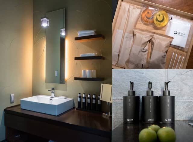 星のや軽井沢では、客室の蛇口から出る水も含め浅間山麓の伏流水が利用され、美味しい水を飲むことができます。パウダールームにはアメニティーや基礎化粧品なども置かれます。