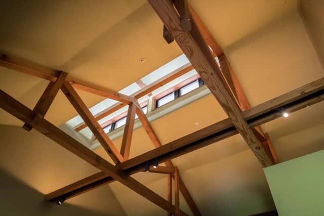 2階の客室は天井が高く、梁が剥き出しになっています。「風楼」と呼ばれる小窓を開けると空気が循環し、夏はエアコンをつけなくても心地よい温度を保つことができる仕組み。敷地内に引き込まれた川は本来水力発電のためのもので、施設内の6~7割のエネルギーの一部を賄うほか、「風楼」などでエネルギー利用量を抑える工夫も施しています。