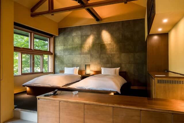 星のや軽井沢を代表する客室「水波の部屋」。池や川に張り出すように建てられた水辺の客室は、非日常感たっぷり。他では体験できない唯一無二の景観と滞在を楽しめます。