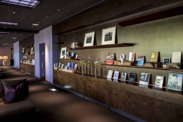 「星野温泉旅館」時代のモノクロ写真が並ぶほか、谷の住人であるスタッフが、季節や時間帯によって選んだ書籍を入れ替えるので、朝と夜では違う書籍が置かれています。ぜひ何度かチェックしてみてください。