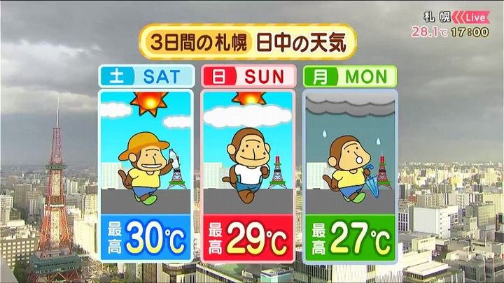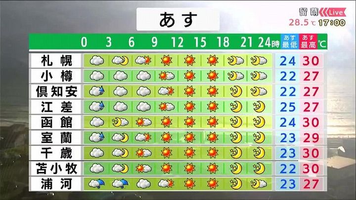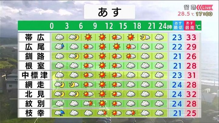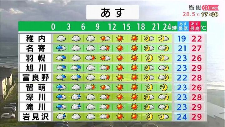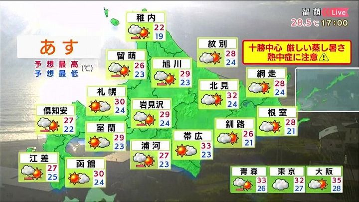 最高気温は稚内で22度のほかは、広く29度前後で、帯広は33度まで上がる予想です。