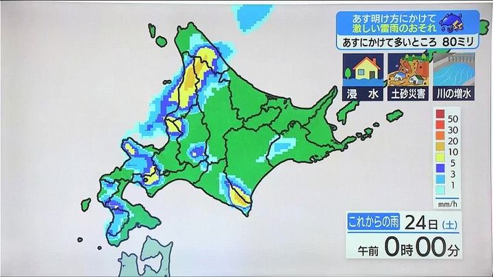 今夜も日高地方や日本海側を中心に激しい雷雨となり、あす24日にかけて多いところで80ミリの雨が降りそうです。