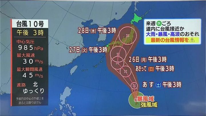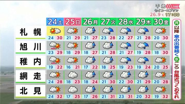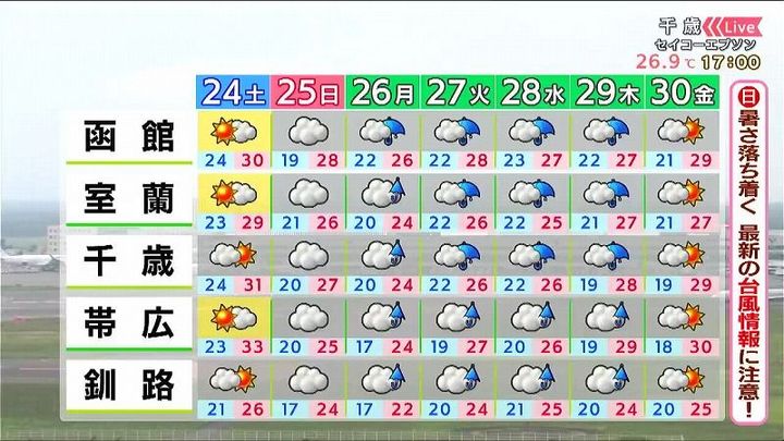 背景は23日午後5時ごろの千歳情報カメラ。台風が近づくとなると、また空の便にも影響が出るかもしれません。来週水曜日ごろ、交通情報にもお気を付けください