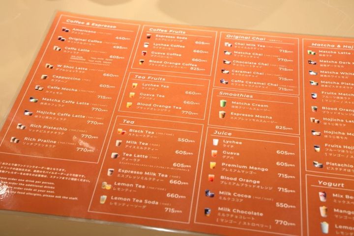 研究を重ねて作り上げたというドリンク。飲みやすさを追求し、エスプレッソを炭酸で割った「エスプレッソソーダ」やフルーツコーヒー、紅茶やジュース、抹茶やほうじ茶のほか、オリジナルのヨーグルトドリンク「ダコグルト」など、味にも見た目にもこだわった、ほかにはないメニューが豊富にそろいます。