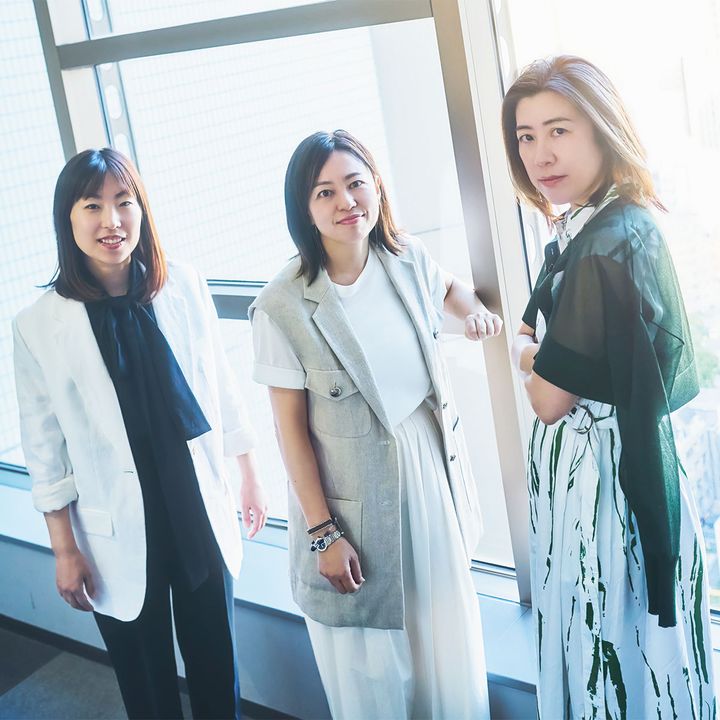 〈野木さん〉シャツワンピース¥22,000(バナナ・リパブリック)シアーカーディガン¥26,400(アンスリード/アンスリード青山店)〈塚原さん〉ジレ¥62,700(エッフェ ビームス/ビームス ハウス 丸の内)Tシャツ¥9,680(スローン/デミルクス ビームス 新宿)ホワイトパンツ¥23,980(NAVE/ネイヴ)その他/ご本人私物〈新井さん〉ホワイトジャケット¥16,500(バナナ・リパブリック)ボウタイブラウス¥37,400(アキコ オガワ/ブランドニュース)ブラックパンツ¥22,990(uncrave WHITE/アンクレイヴ)その他/ご本人私物