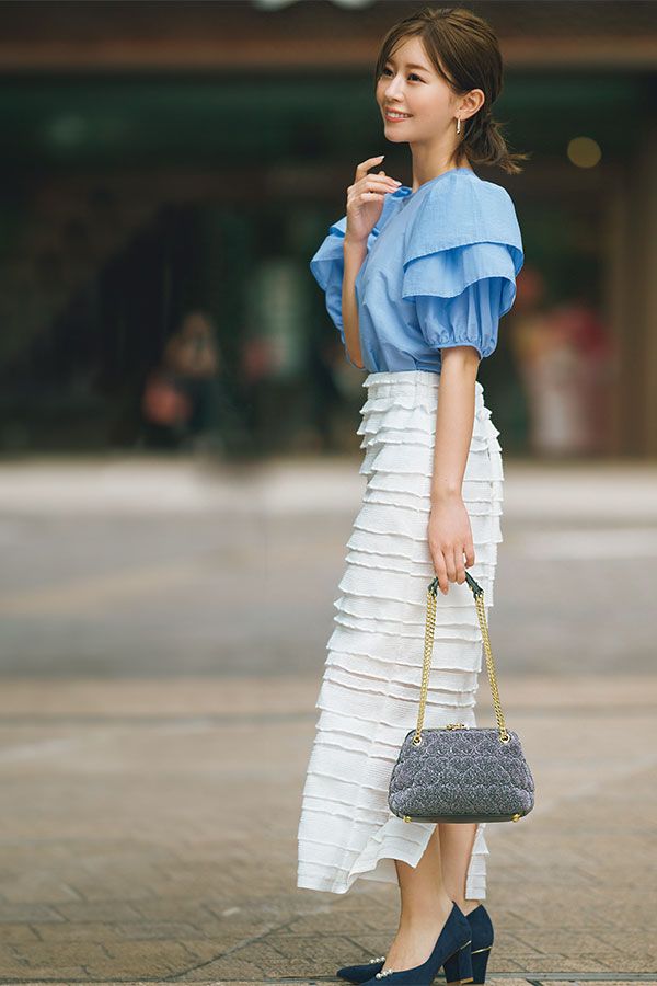 何段ものティアードに彩られた甘デザインでも、ペンシルなら大人っぽくモードな今っぽ感。ふんわりティアード袖のブラウスでさらに糖度を上げ、THE百花フェミニンを極めて。