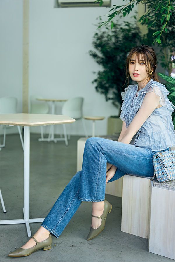 甘口フリルをこなれて見せるにはデニムパンツがひと役。ワントーンでまとめることでデニムのラフさが抑えられる効果も。