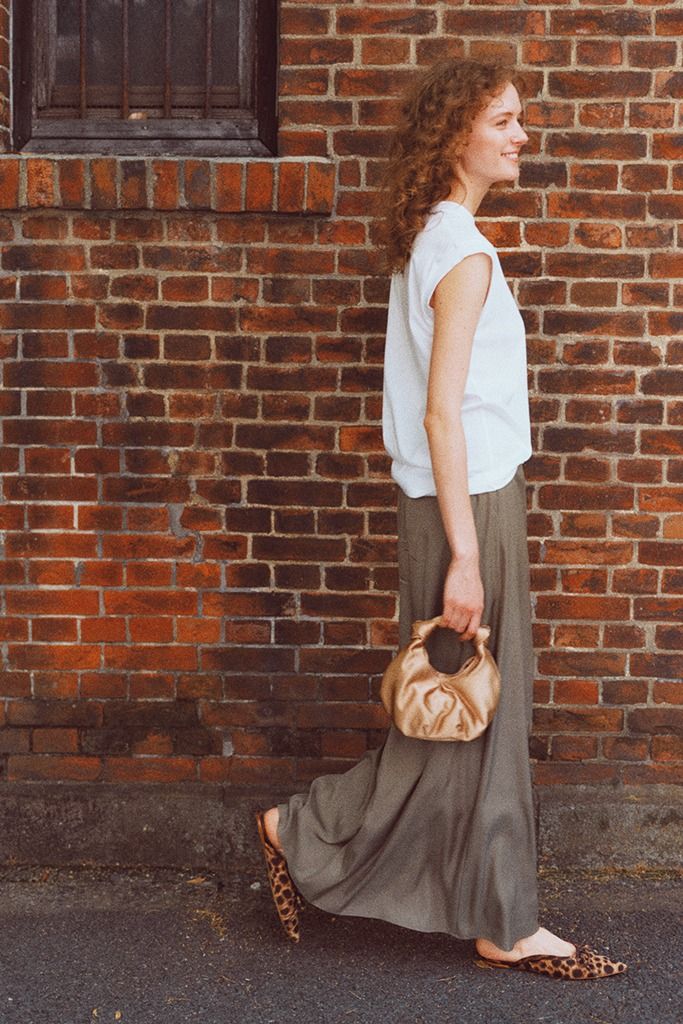 Tシャツやタンクトップ、ビッグシャツなど、カジュアルなトップスに合わせるだけでクラス感が宿る、サテン素材のボトム。その中でも微光沢を含んだ、柔らかく縦に落ちる質感のスカートで、リラックスしながらもドレッシーな装いに。