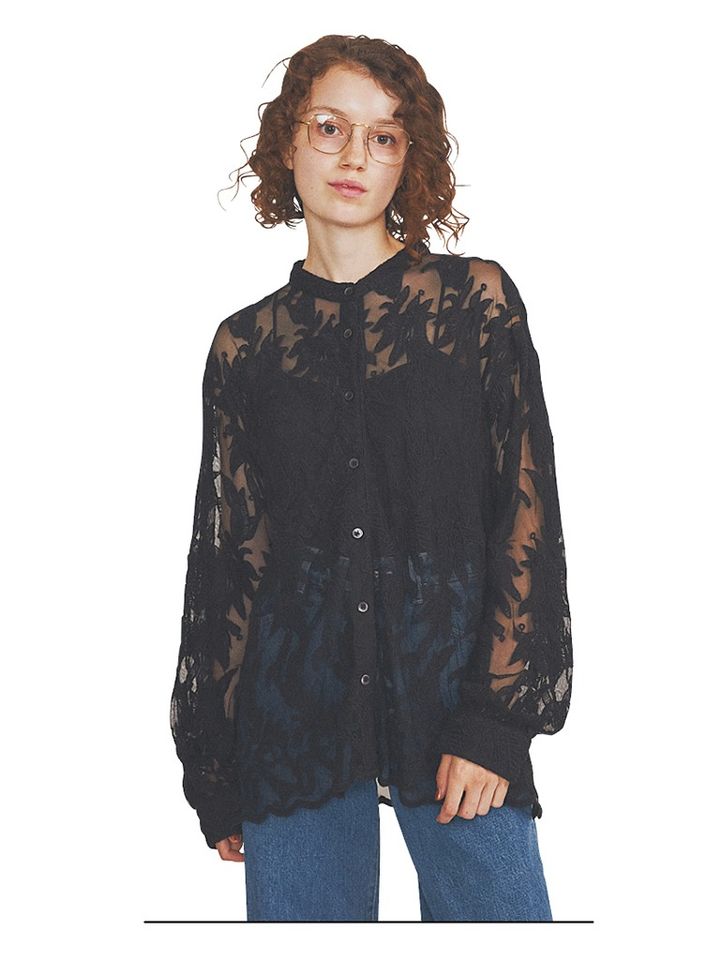 体を覆いつつも素肌感を残せるレースやチュールの生地で、シャツに「キレイな甘さ」を加算。見え隠れする肌やしっとりとした質感が陥りがちな重さを払い、ニュアンスにつながる脱力感をマーク。