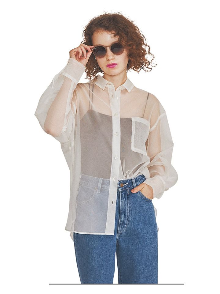 3. ゆるく透ける「透明感のあるシャツ」タンクトップやキャミソール姿に似合う「甘くてキレイなデザイン」